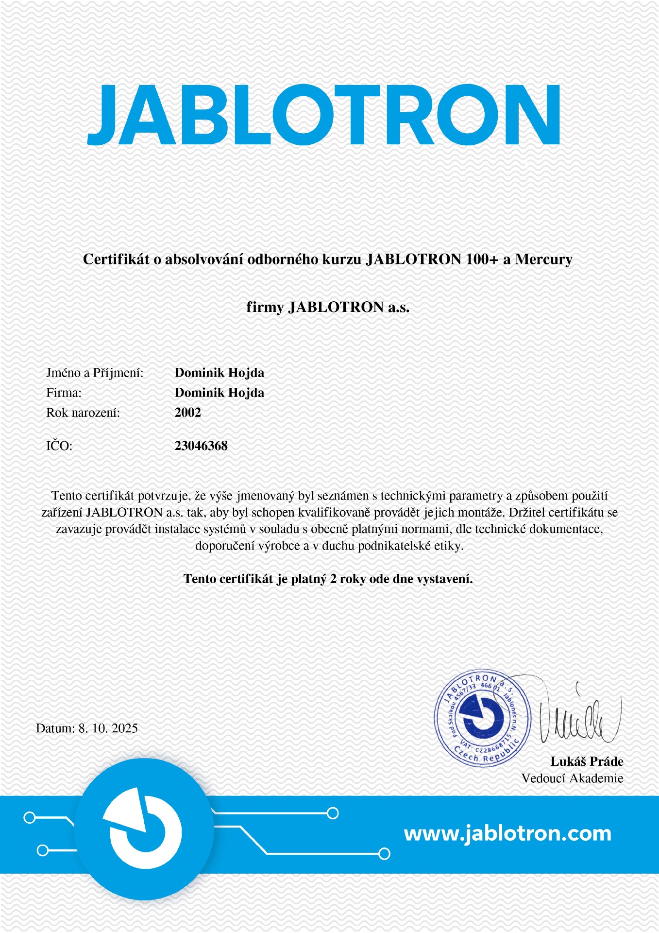 S potěšením oznamujeme, že společnost Foxtronic Technology úspěšně získala oficiální certifikaci od společnosti Jablotron, která nás oprávňuje k montážím, údržbě a projektování elektronických zabezpečovacích systémů (EZS). Tato kvalifikace potvrzuje naše technické schopnosti i závazek pracovat podle nejvyšších standardů a doporučení výrobce.
